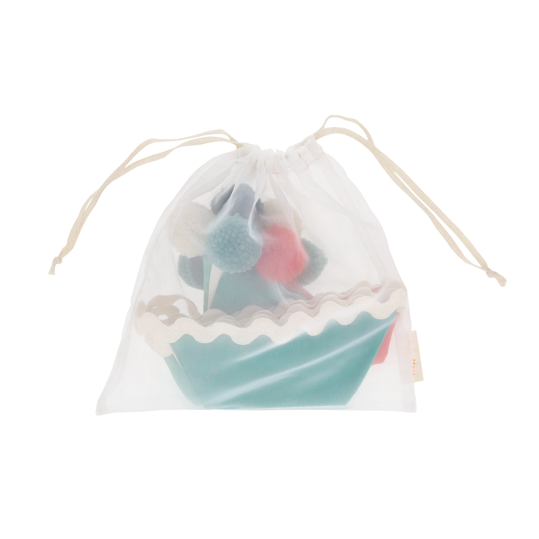 - Each flag has a yarn pompom, sewn on the point, in a co-ordinating color of dark mint, teal, red and cream
