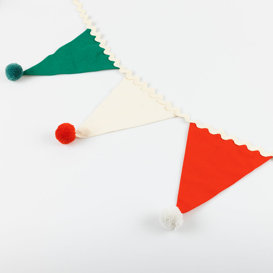 This pompom flag garland is the ultimate way to add a bold, festive touch to any space. Perfect to drape across a mantel; string along a staircase; or hang in a window, doorway or porch, for a joyful look. The mix of festive fabric flags with yarn pompoms, all in classic Christmas colors, adds texture and charm. Plus it's lightweight, easy to hang and reusable, to bring back the holiday magic year after year.