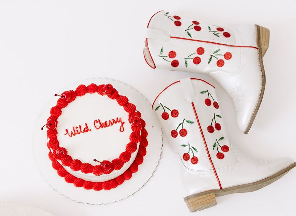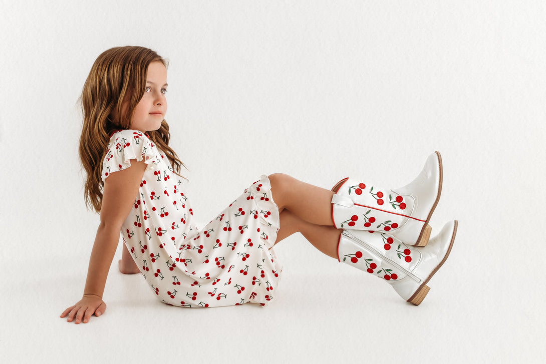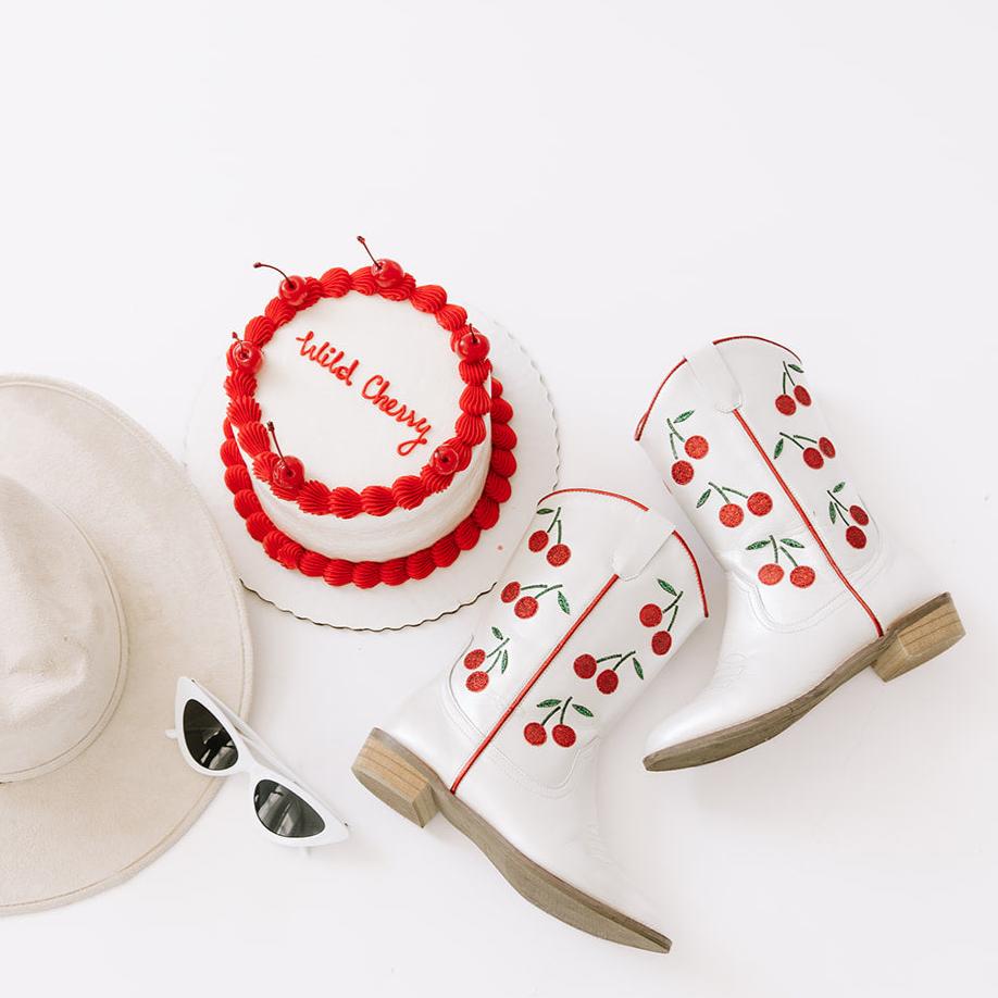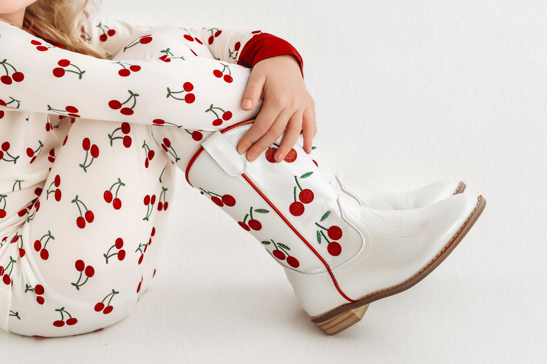 Genuine white pearly leather with glittery cherries. Genuine Leather boot with hand sewn cherry detailing. Hand stitched piping and toe detailing. Full zipper for easy wear.