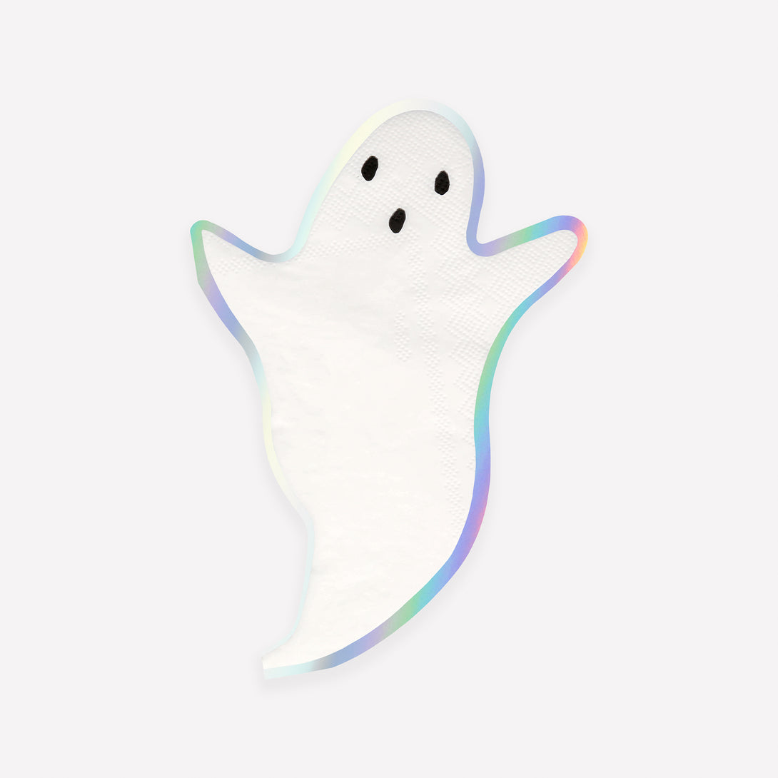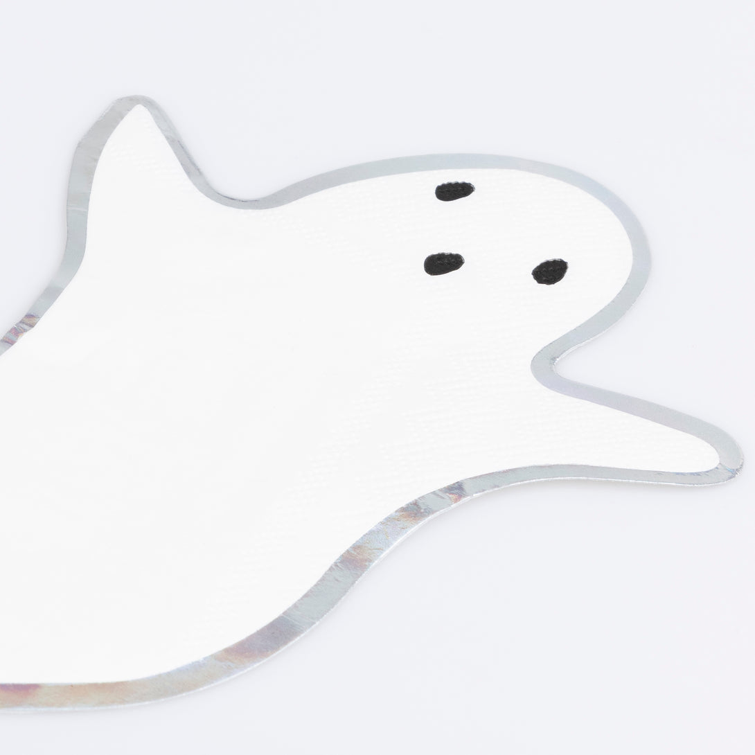 Boo! Elevate your Halloween party with our ghost-shaped paper napkins. Designed with a classic floaty ghost silhouette and a dazzling silver holographic foil border, they create a hauntingly cool effect. Perfect for kid-friendly gatherings or creepy cocktail parties.