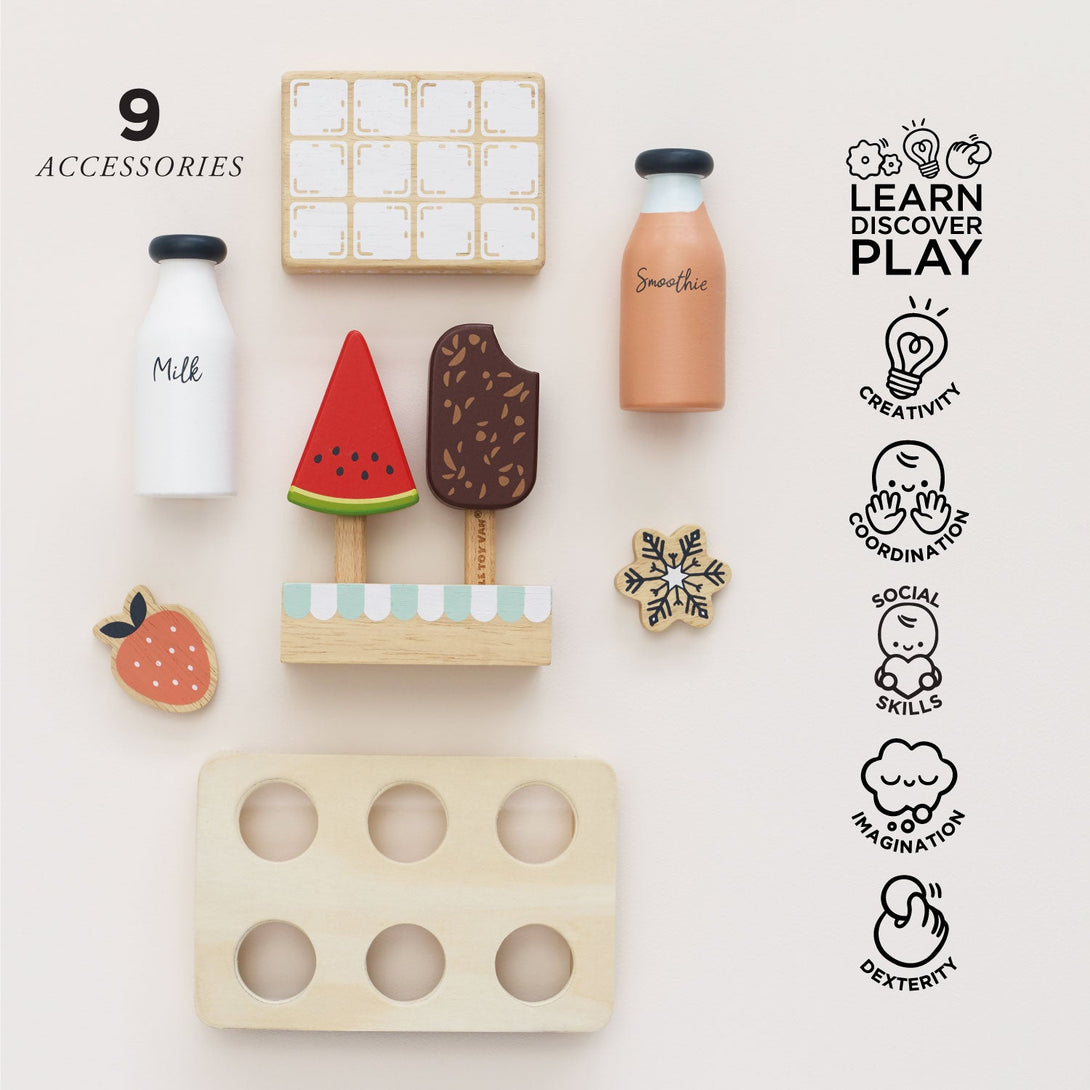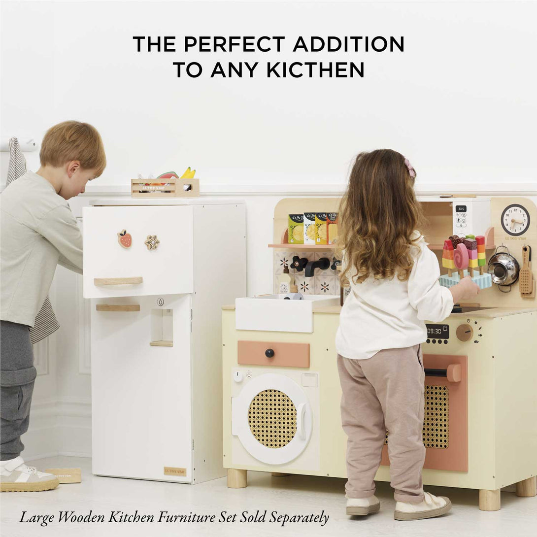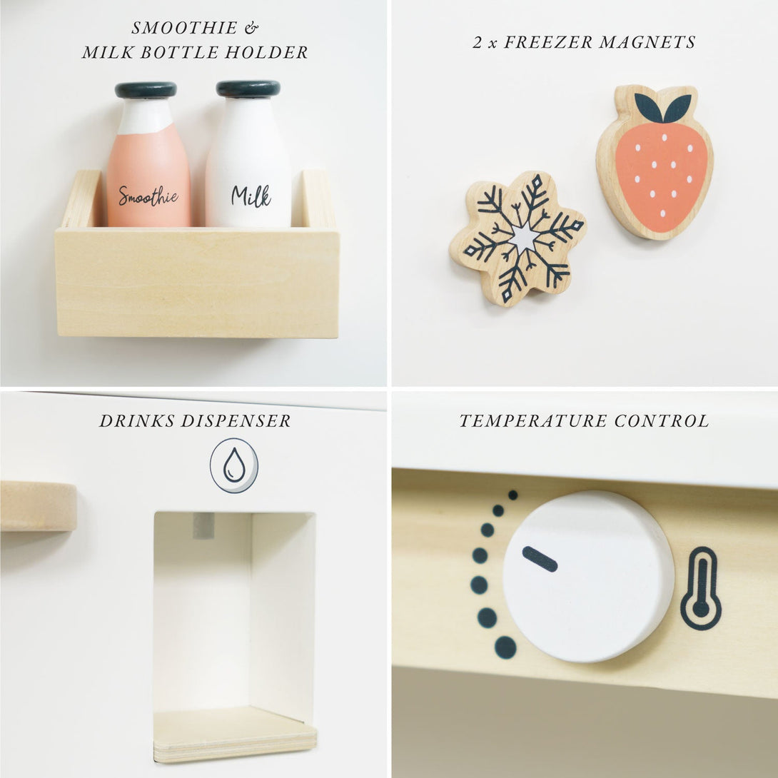 Upgrade your dream kitchen set up with this stunning freestanding fridge freezer unit. Made from FSC® - certified wood, with an appealing retro style design, this durable toy is jam packed with interactive features for inspired role play fun.  Discover the built in water dispenser, temperature control and fruit and veg compartments for stocking up on their five a day. Complete with a host of accessories including 2 ice lollies and stand, egg and ice trays plus a milk and smoothie bottle. The freezer door is magnetic, plus there are two handy fridge magnets for realistic play value. compatible with our large kitchen as well as our extensive collection of play food and accessories.