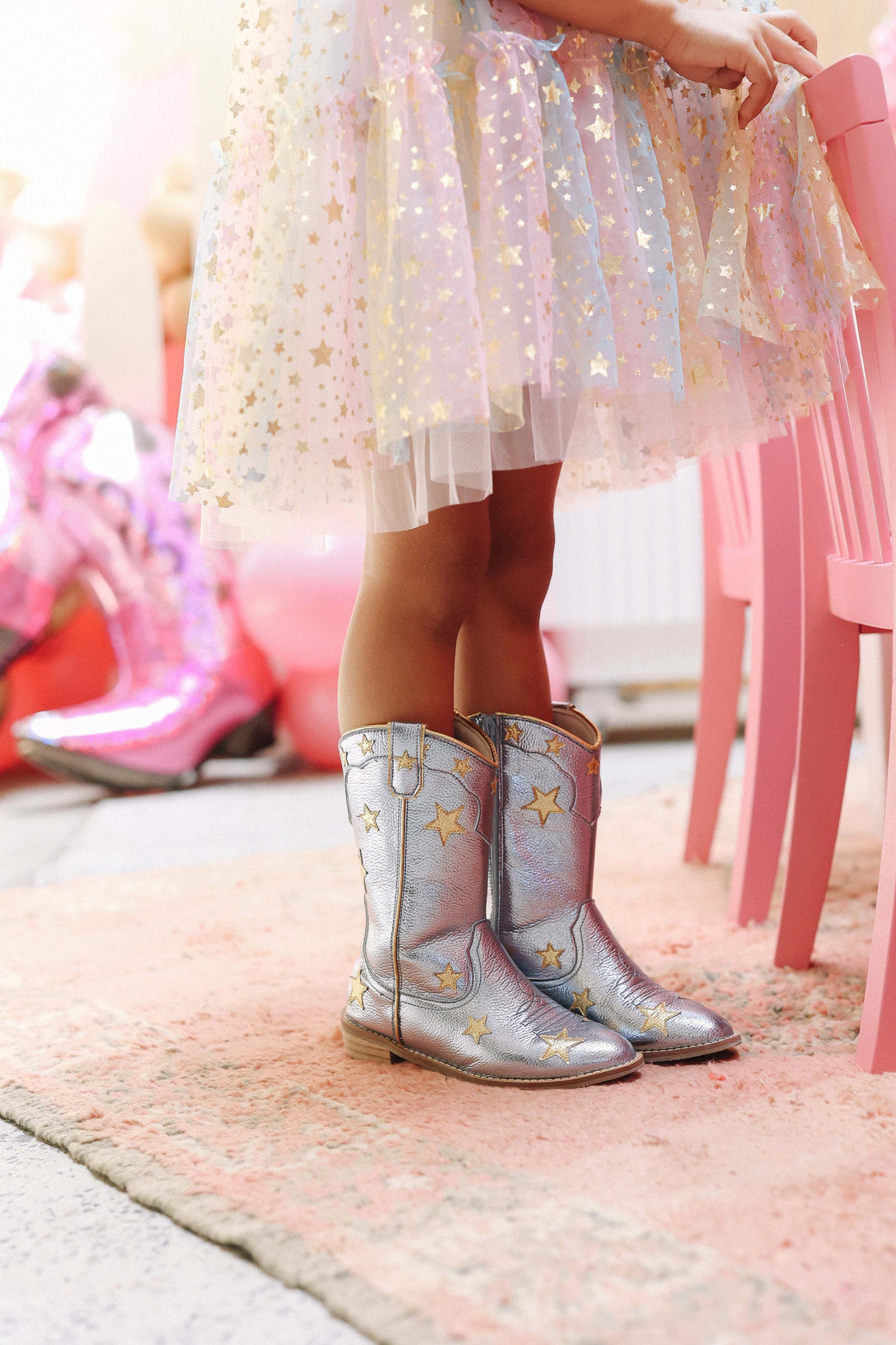 Genuine Leather metallic boots with hand stitched stars. Hand stitched piping and cowboy boot toe detailing. Full zipper for easy wear.