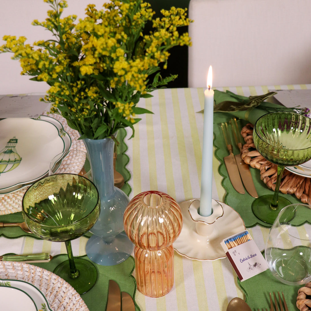 Cream ceramic candle holder with a fluted design and gold-trimmed edges.