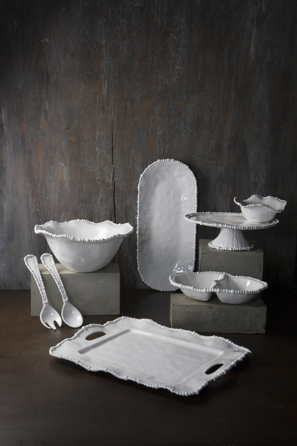 Melamine, reinvented. A brilliant white finish and pearl-rimmed styling make the Beatriz Ball VIDA Alegria Large Salad Servers (White) the ideal choice for bowls in this collection of luxury melamine. The attractive servers are made of high quality melamine for everyday enjoyment. Perfectly suited for indoor and outdoor entertainment, Alegria is a collection as joyful as its name. Mix and match with our other melamine items for a vibrant tablescape, or pair with our large white bowl for a great salad set. Decorative servers made of luxury melamine are always appreciated, so pair them with any bowls for a great gift combo. Dishwasher safe (top rack), heavy-weight, food safe, BPA and PABA free.
